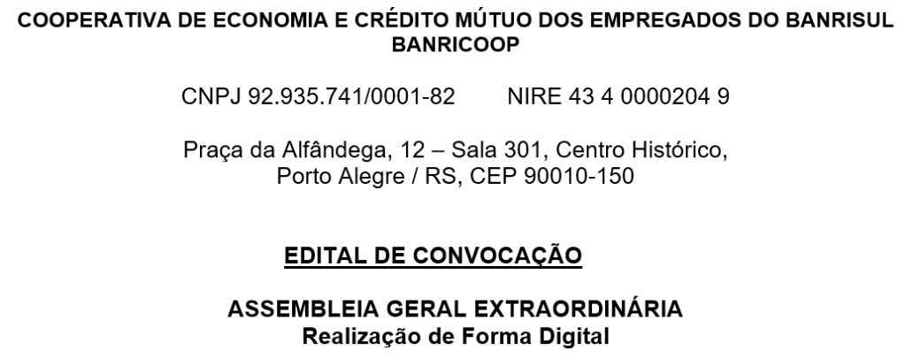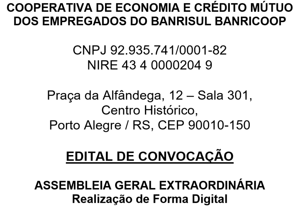 O Presidente da COOPERATIVA DE ECONOMIA E CRÉDITO MÚTUO DOS EMPREGADOS DO BANRISUL, sigla BANRICOOP, no uso das suas atribuições estatutárias e legais, com as adaptações decorrentes do artigo 43-A da Lei nº 5.764 de 1971 e artigo 17-A da Lei Complementar nº 130 de 2009; na regulamentação que lhe confere a Instrução Normativa nº 81 de 10 de junho de 2020, do Departamento Nacional de Registro Empresarial e Integração do Ministério da Economia; observado ainda o disposto nos artigos 57, § 2º, 59 e 46, todos da Lei nº 5.764/71, combinados com as Resoluções n° 4.434/15 e 5.088/2022 do Conselho Monetário Nacional e Instrução Normativa nº 299 de 2022 do Banco Central do Brasil, convocam seus associados para, em 25 de novembro de 2025, nos horários abaixo expostos, através de ambiente digital, reunirem-se em ASSEMBLEIA GERAL EXTRAORDINÁRIA (AGE), para deliberar sobre a Ordem do Dia a seguir exposta: